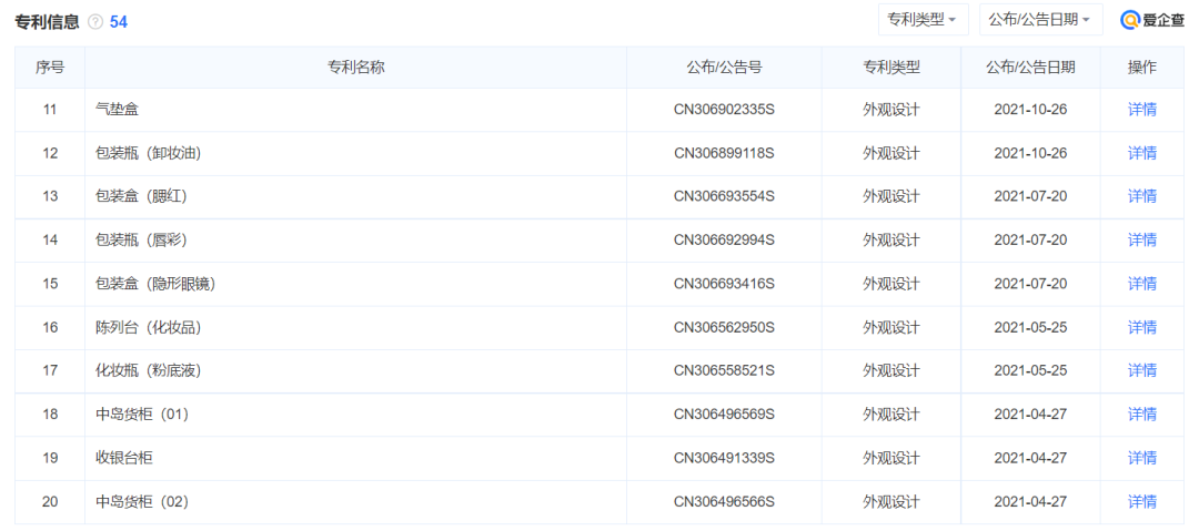 除此之外,鋅刻度通過愛企查搜索了逸仙電商的專利信息,在54項專利當中,并無一項是技術研發(fā)的成果,而是唇膏膏體、外包裝、展示柜、陳列臺、香水瓶等外觀設計專利。
