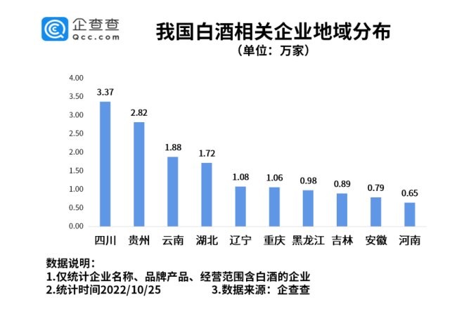 企查查數(shù)據(jù)顯示,從區(qū)域分布來看,四川以3.37萬家白酒相關企業(yè)排名第一。貴州、云南分別有2.82萬家、1.88萬家白酒相關企業(yè),位居前三。此后依次為湖北、遼寧等省份。
