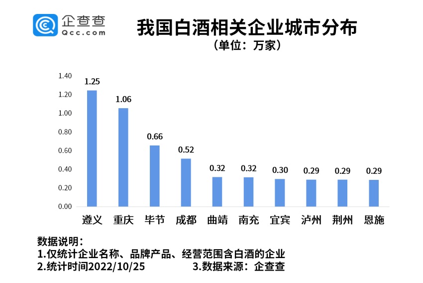 企查查數(shù)據(jù)顯示,從城市分布來看,遵義以1.25萬家白酒相關企業(yè)排名第一。重慶、畢節(jié)分別有白酒相關企業(yè)1.06萬家、0.66萬家,排名前三。此后依次為成都、曲靖、南充等城市。