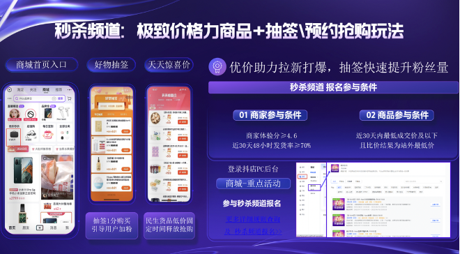 今年雙11趙凡提到,抖音商城從玩法,氛圍,全周期經(jīng)營,營銷工具,數(shù)據(jù)產(chǎn)品等多個維度進行全面升級,其中以抖音商城為承載的中心場成為平臺大促的重頭戲,商家端玩法包括跨店每滿減、定金預售、商城消費券、抖音商城超值購、抖音商城低價秒殺等。