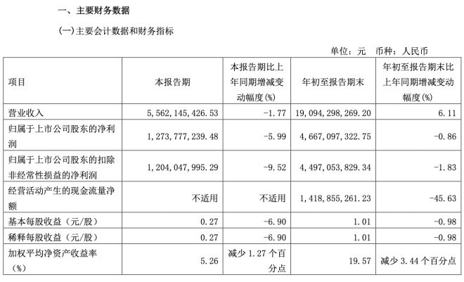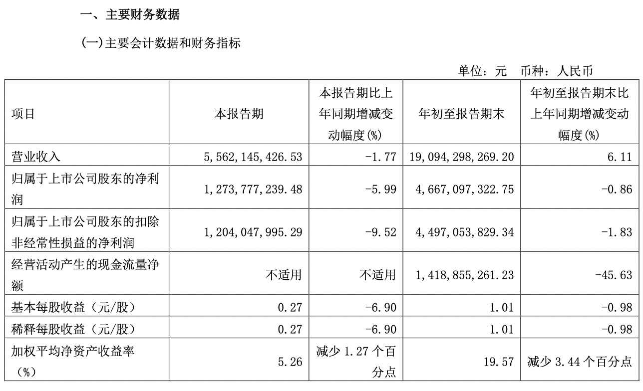 第三季度營業(yè)收入約為55.62億元,同比下降1.77%,歸屬于上市公司股東的凈利潤約為12.74億元,同比下降5.99%,每股收益為0.27元/股,同比下滑6.9%。