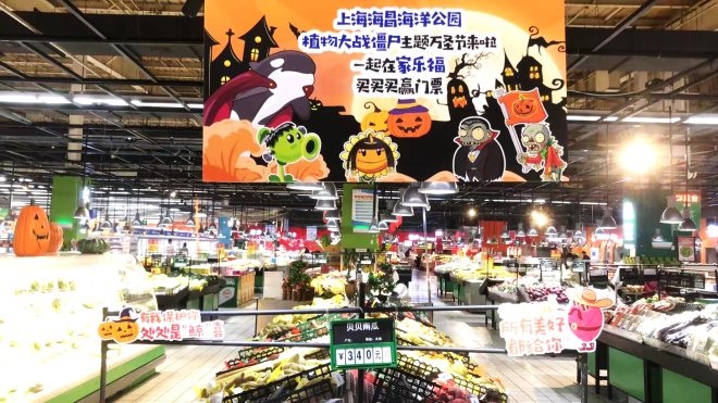 據(jù)了解今年萬圣節(jié),家樂福與上海海昌海洋公園強(qiáng)勢(shì)合作,推出了以植物大戰(zhàn)僵尸為主題的專屬萬圣趴,并在全國(guó)家樂福門店上演,目前在上海近30家家樂福門店已經(jīng)布展完成。