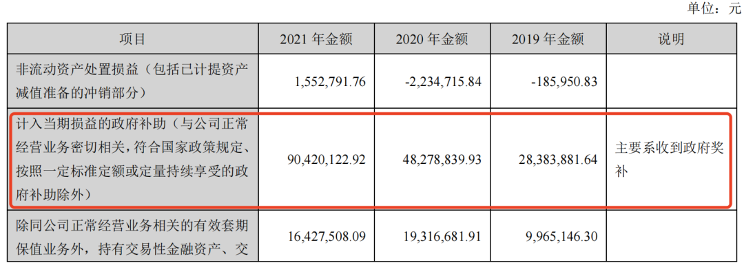 2018-2021年,公司計入當期損益的政府補助分別為5333.14萬元、2838.39萬元、4827.88萬元、9042.01萬元,分別占當期凈利潤的17.55%、11.89%、16.02%、21.99%。