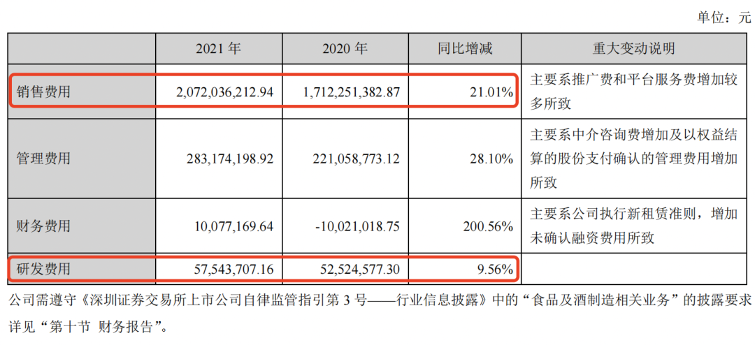 2016年至2021年間,三只松鼠銷售費用分別為9.178億、10.75億、14.61億、22.98億、17.12億元、20.72億元,占營收比例為20.75%、19.36%、20.87%、22.59%、17.48%、21.21%。