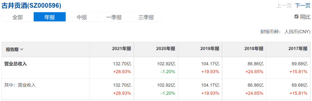 根據(jù)各公司年報(bào)顯示,古井貢酒2021年全年?duì)I收132.7億元,同比增長(zhǎng)28.93%,凈利潤(rùn)21.86億元,同比增長(zhǎng)23.9%。