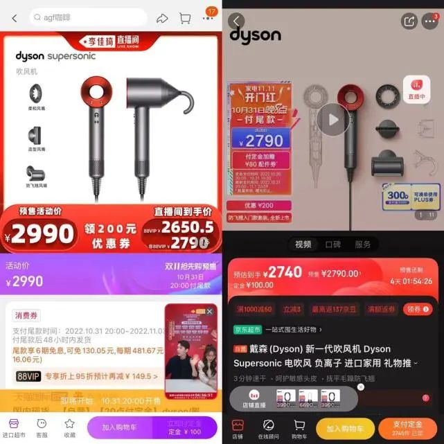 其他品類更是如此。以家電為例,網紅產品戴森HD08紅色吹風機在頭部主播直播間使用200元優(yōu)惠券后的到手價為2790元,但京東到手價僅需2740元,此類產品蹲守直播間明顯并不劃算。