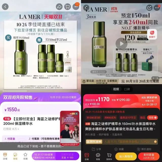 以李佳琦最為強勢的美妝品類為例,熱門產品如SK2神仙水,李佳琦直播間的價格為買兩瓶230ml正裝,贈送12瓶30ml小樣以及4瓶10ml小樣,共計860ml到手價3180元,平均3.7元/ml。相比之下,在中免海南小程序直接購買兩瓶230ml正裝,享8.8折優(yōu)惠以及平臺70元購物券后,到手價1741元,平均3.78元/ml。