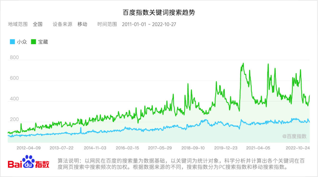 逸仙收購(gòu)科蘭黎的2020年,恰逢小眾美妝品牌在國(guó)內(nèi)集中爆發(fā)。百度指數(shù)顯示,2020年1月起“小眾”“寶藏”的搜索熱度明顯升高,并維持波動(dòng)高位,這一趨勢(shì)在移動(dòng)端搜索熱度顯示更為明顯。