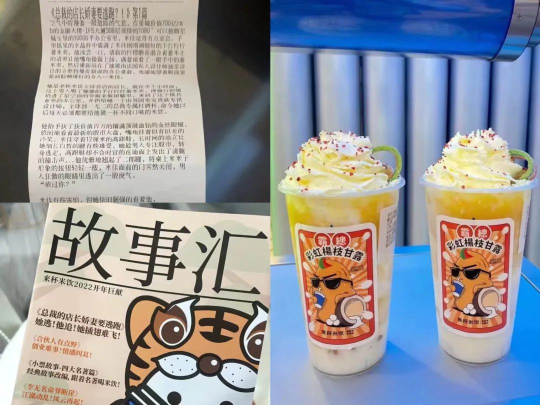 到去年年底時,來杯米飲把半年更新的小說集合起來,做了一本“故事匯”送給粉絲,還根據(jù)小票內(nèi)容開發(fā)了一款新品——霸總彩虹楊枝甘露。