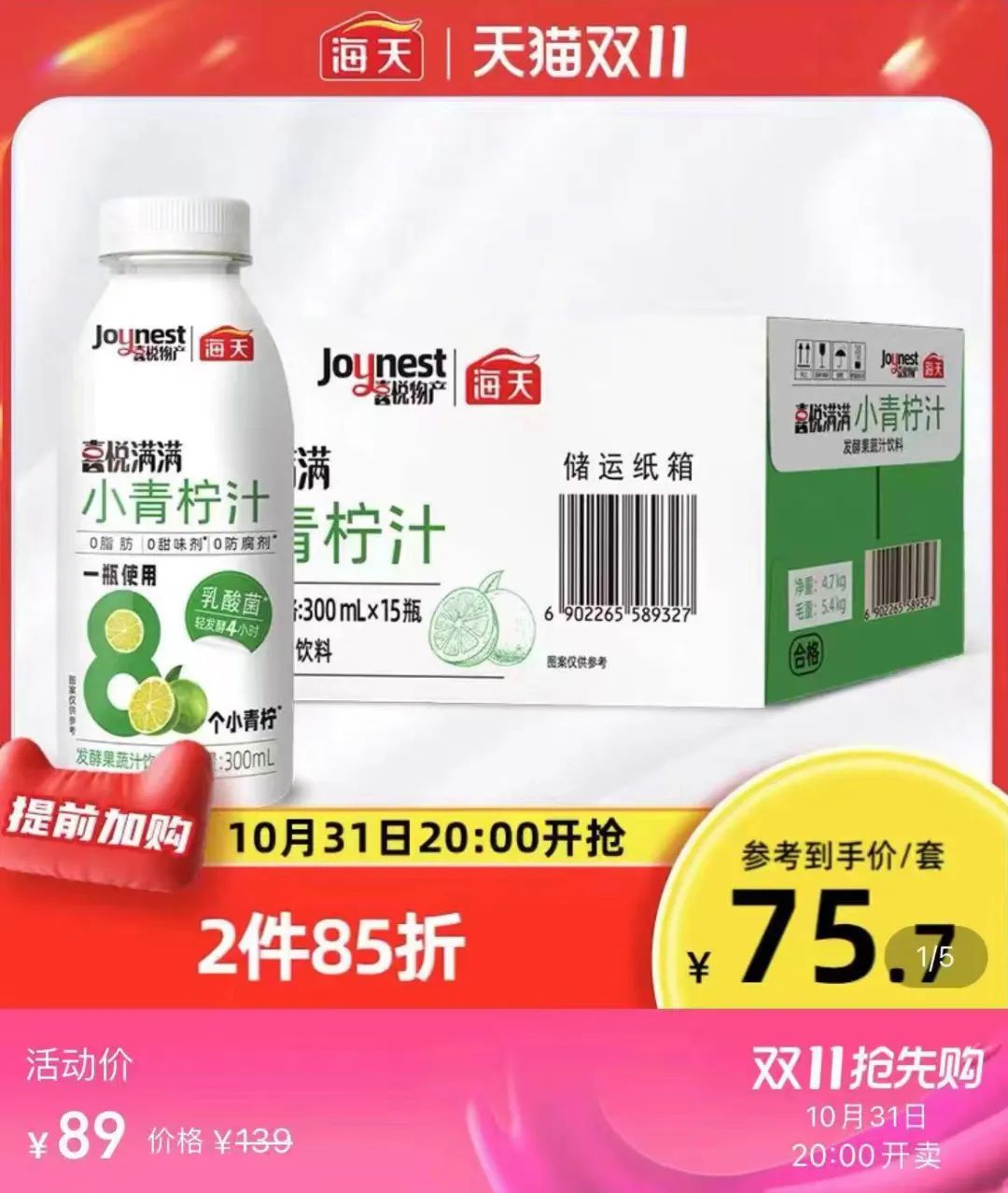 日前,“醬油大王”海天味業(yè)在其小程序“海天美味館”及海天官方旗艦店上推出了飲料新品“喜悅滿滿小青檸汁”,主打0脂、0防腐劑、發(fā)酵。其在小程序定價(jià)75元/15瓶×300ml,天貓官方旗艦店定價(jià)99元/15瓶×300ml。除小青檸汁外,海天味業(yè)的喜悅滿滿系列在今年8月推出首款飲料產(chǎn)品胡蘿卜汁,同樣為發(fā)酵果蔬汁飲料。