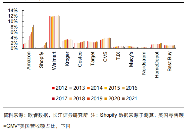 這一點(diǎn)可以從數(shù)據(jù)上體現(xiàn),2012年至2021年在美國的電商零售行業(yè)中,Shopify市場份額由的0.24%上升至11%左右,而以傳統(tǒng)零售為主的沃爾瑪電商零售市場份額從3%上升至8%。流量增速也有同樣反饋,根據(jù)Finbold最新數(shù)據(jù),亞馬遜在美國的在線流量增長率僅為28.12%。其中,SheIn以183.45%的增速,位居2022年美國在線流量增長率電商平臺的第一名。