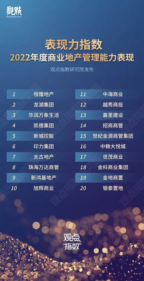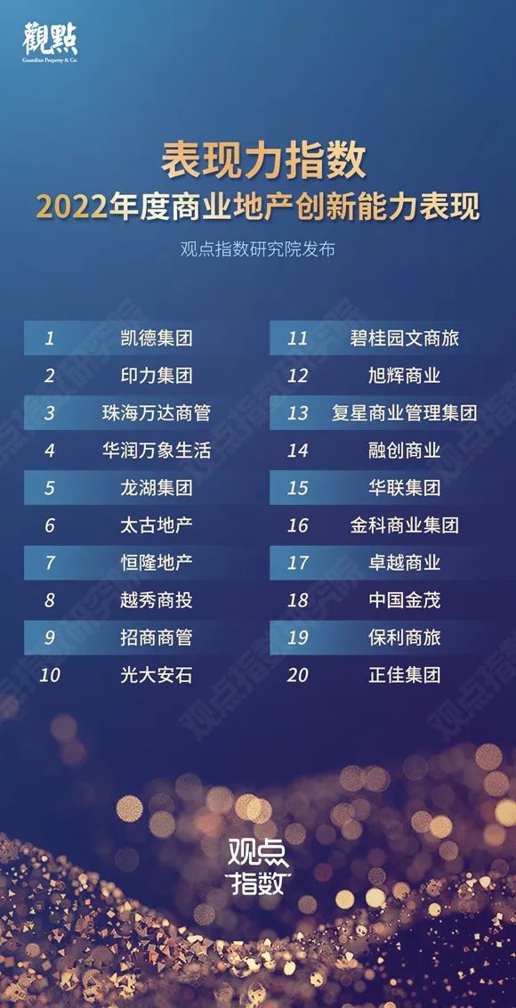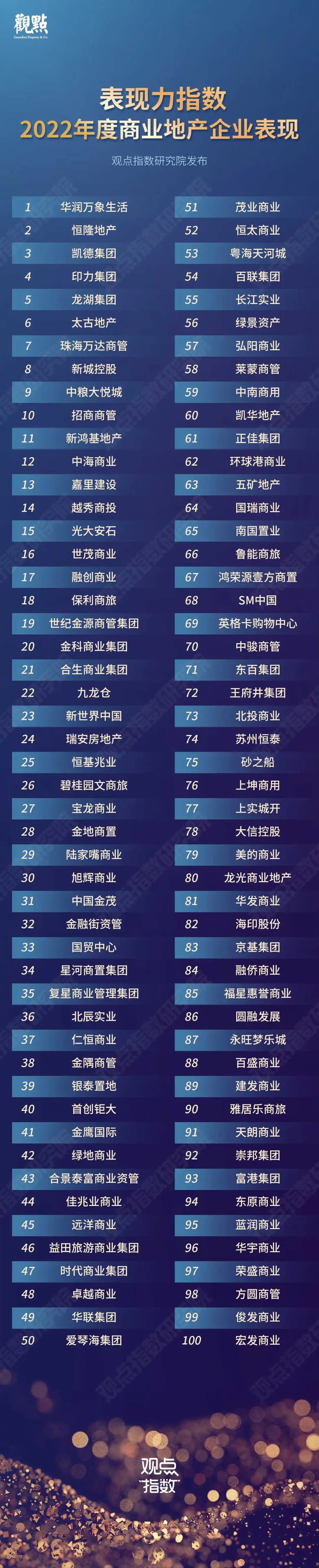 觀點指數(shù)通過對2022年度商業(yè)地產(chǎn)市場的表現(xiàn)進行研究,發(fā)布"表現(xiàn)力指數(shù)·2022年度商業(yè)地產(chǎn)企業(yè)表現(xiàn)"研究成果。其中,華潤萬象生活、恒隆地產(chǎn)、凱德集團表現(xiàn)出色,在研究成果名單中居于前位。