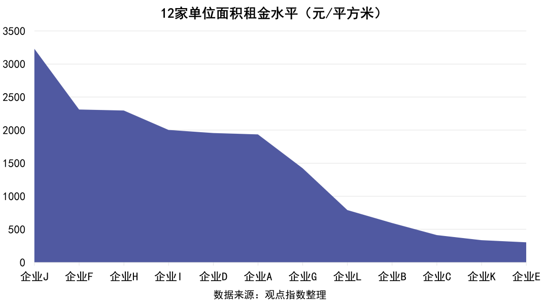 內(nèi)資企業(yè)中單位租金水平最高的是企業(yè)G,超過1500元/平方米,其余大部分企業(yè)在500元/平方米左右水平,這與內(nèi)資企業(yè)布局城市較多,涵蓋多能級城市有較大關(guān)系。