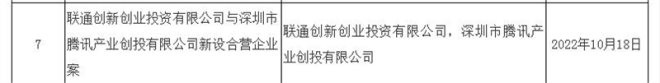 11月2日消息,據(jù)國(guó)家市場(chǎng)監(jiān)管總局官網(wǎng)10月27日發(fā)布的《2022年10月17日-10月23日無條件批準(zhǔn)經(jīng)營(yíng)者集中案件列表》顯示,聯(lián)通創(chuàng)新創(chuàng)業(yè)投資有限公司與深圳市騰訊產(chǎn)業(yè)創(chuàng)投有限公司新設(shè)合營(yíng)企業(yè)案獲無條件批準(zhǔn),審結(jié)時(shí)間為10月18日。