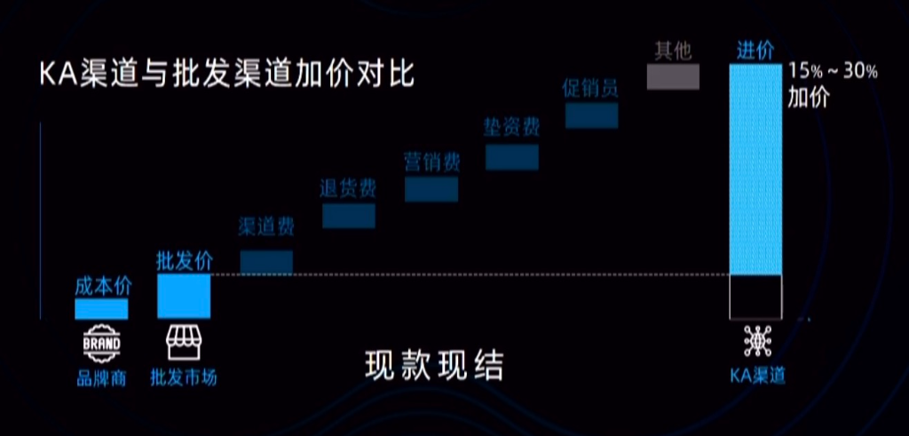 傳統(tǒng)零售KA銷售渠道下,商品從生產(chǎn)商出來(lái),可能會(huì)經(jīng)歷品牌商、批發(fā)市場(chǎng),疊加渠道費(fèi)、退貨費(fèi)、營(yíng)銷費(fèi)、墊資費(fèi)等,最終門店進(jìn)價(jià)加價(jià)幅度可能在15%-30%。羊毛出在羊身上,消費(fèi)者就要為這些加價(jià)買單,商品售價(jià)就難以打下來(lái)。