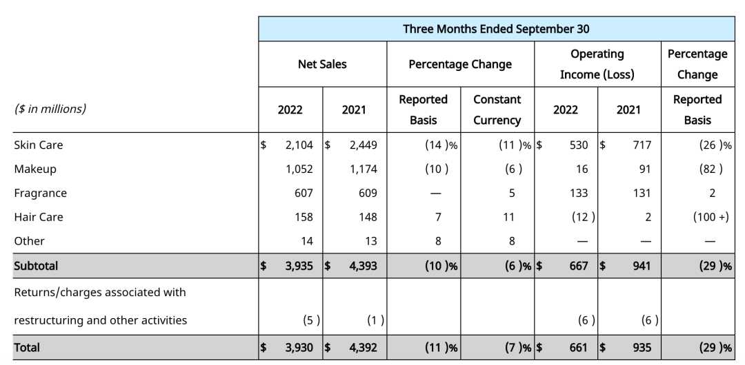 從具體業(yè)績來看,護(hù)膚板塊銷售額占比仍為最高,上季度凈銷售額為153.21億元,同比下滑14%。對(duì)此,雅詩蘭黛表示,影響上季度營收的重要因素包括中國長期嚴(yán)格的疫情防控措施帶來的旅游零售限制,以及國內(nèi)外零售商開始收緊庫存。