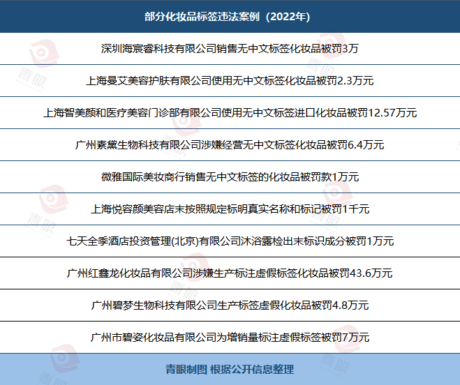 從下圖青眼梳理的10起標(biāo)簽違法相關(guān)案件中可發(fā)現(xiàn),10家企業(yè)合計(jì)被罰81.77萬元,其中有5家企業(yè)皆因銷售無中文標(biāo)簽化妝品被罰。如上海智美顏和醫(yī)療美容門診部有限公司從廣州某公司購進(jìn)5種進(jìn)口化妝品,卻均無中文標(biāo)簽。同時(shí),該公司在其經(jīng)營場所使用上述產(chǎn)品,涂抹于顧客面部皮膚,聲稱起到亮膚作用。最終,智美顏和被上海市監(jiān)局責(zé)令立即改正,沒收違法所得并處罰款,總計(jì)約12.57萬元。
