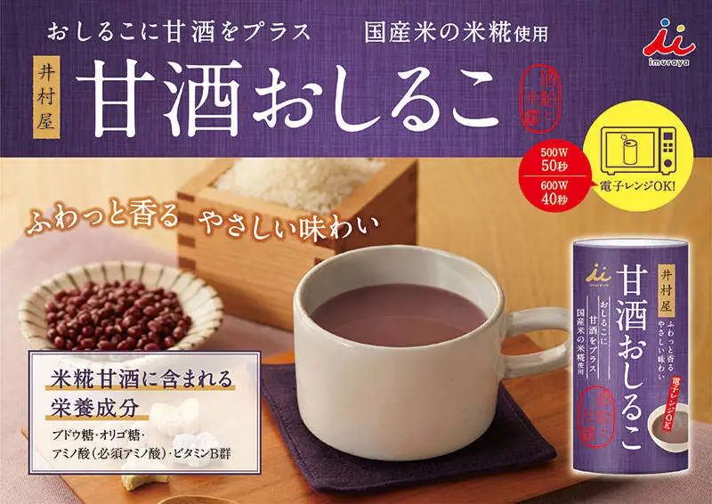 除了姜以外,酒也是典型的自帶熱屬性的食物。在眾多酒類食物中,甘酒因其健康益處而備受關(guān)注。其中,由米曲制成的曲甘酒營養(yǎng)豐富,甚至因?yàn)楹写罅康木S生素、氨基酸和礦物質(zhì)等多種營養(yǎng)素,且易被人體吸收,還被親切地稱為“可飲用的點(diǎn)滴”。去年八月,井村屋株式會社便將曲甘酒與旗下紅豆產(chǎn)品創(chuàng)新性融合,開發(fā)出新品紅豆甘酒(甘酒おしるこ),產(chǎn)品在取下蓋子后直接在微波爐中加熱。