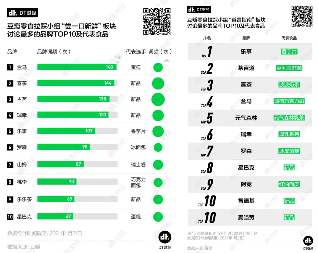 社交媒體上,討論盒馬的熱度一直很高。在小紅書上,在盒馬種草、拔草都非;馃幔#盒馬必買#擁有近4000萬瀏覽量。而在有26萬組員的豆瓣“零食拉踩小組”,盒馬也表現(xiàn)亮眼。DT財經(jīng)曾統(tǒng)計發(fā)現(xiàn),在近萬條帖子中,盒馬的產(chǎn)品力壓一眾新老大牌,熱度位列組內(nèi)安利板塊第一、避雷板塊第四,喜提“最有存在感品牌”大獎。