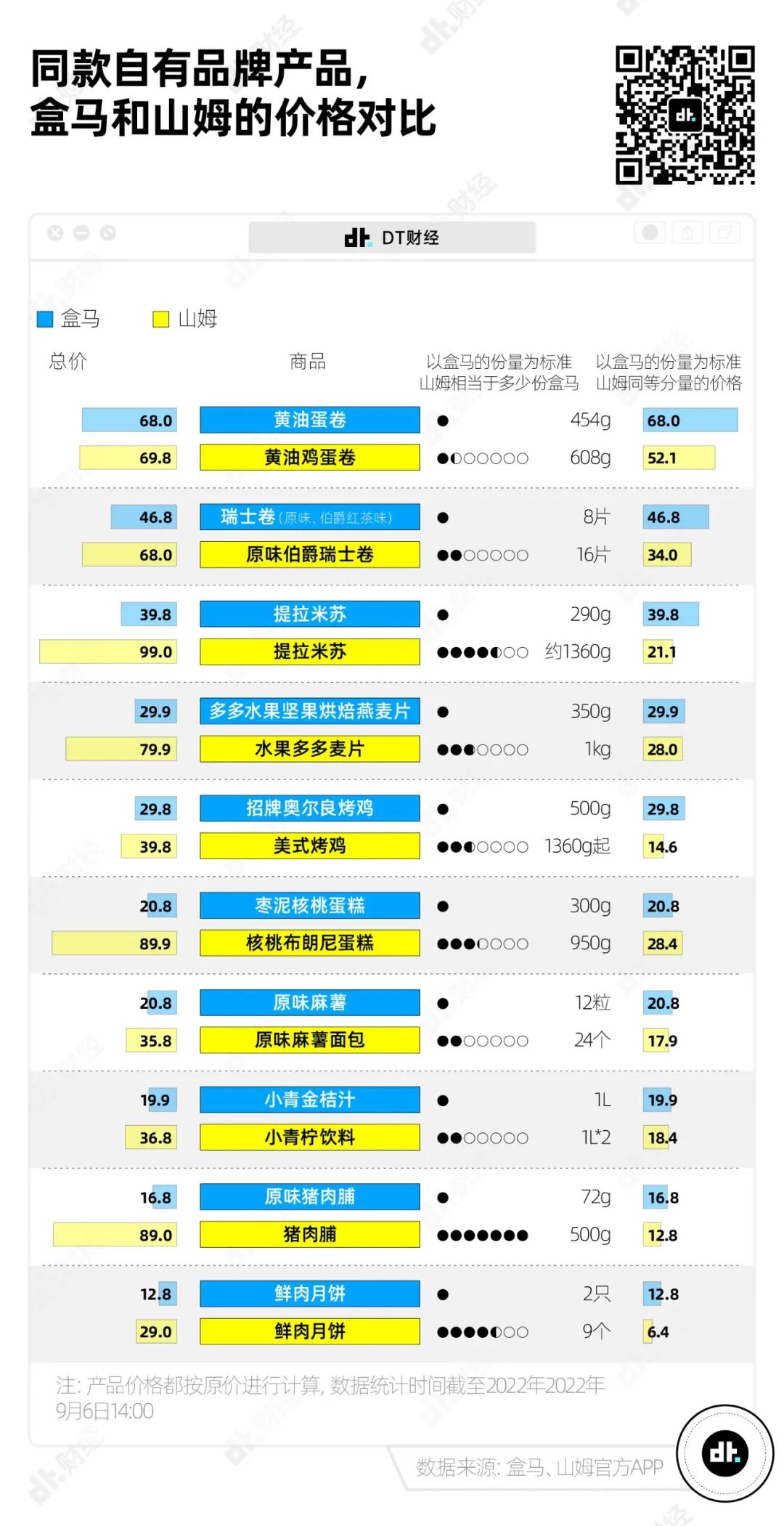 我們對比了盒馬和山姆10款同款或相似的自有品牌商品(盒馬&MM),發(fā)現(xiàn)以單價算,其中9款商品,盒馬的價格都比山姆更貴。
