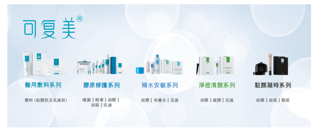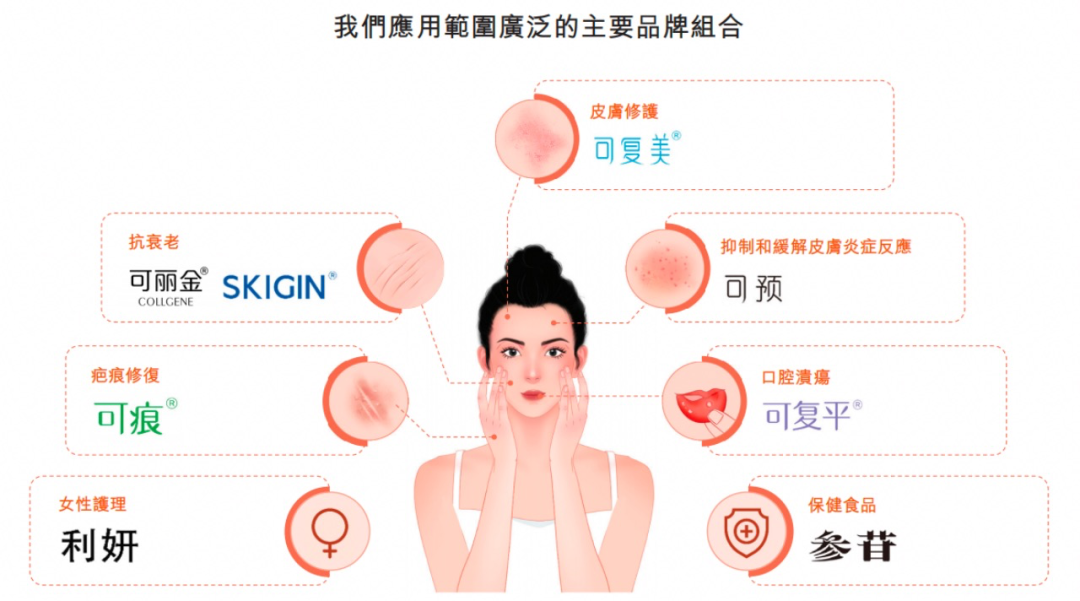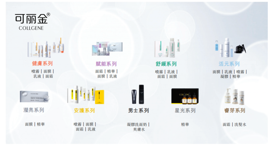 招股書(shū)顯示,巨子生物的產(chǎn)品管線包括85款在研產(chǎn)品,產(chǎn)品組合則包括105項(xiàng)SKU,涵蓋功效性護(hù)膚品、醫(yī)用敷料和功能性食品的八大主要品牌,即可復(fù)美、可麗金、可預(yù)、可痕、可復(fù)平、利妍、欣苷(SKIGIN)以及參苷。可滿足術(shù)后修護(hù)、初老肌膚、易敏感肌、問(wèn)題肌膚等不同人群多樣化的護(hù)膚需求。