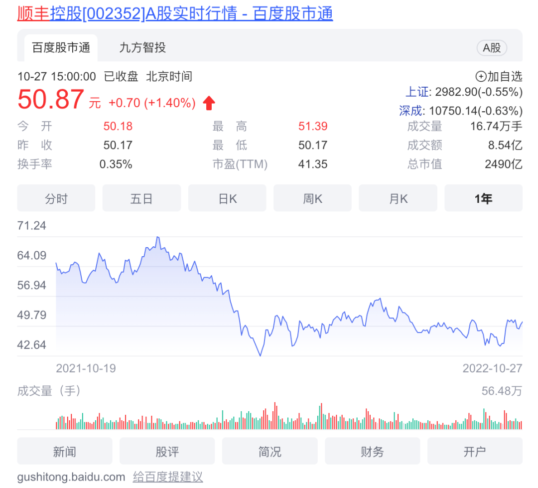 發(fā)布前三季度業(yè)績(jī)暴增后,順豐股價(jià)連續(xù)兩天上漲,累計(jì)漲幅達(dá)11.87%。但是整體來(lái)看,目前順豐的股價(jià)僅為50元/股左右,相較于2021年初120元/股左右的高點(diǎn),下跌了近60%。