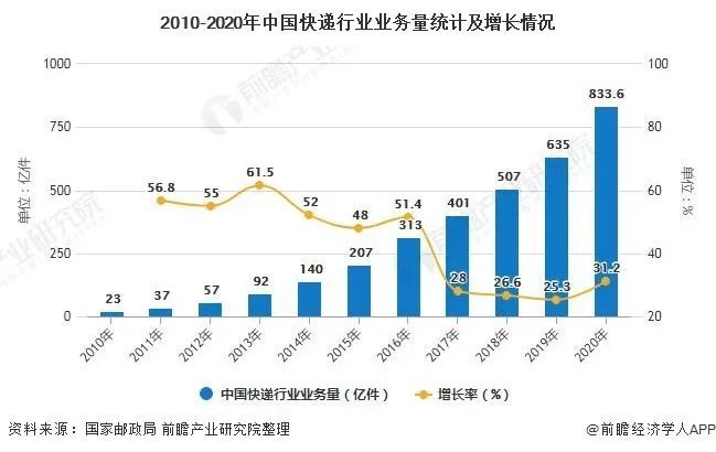 前瞻產(chǎn)業(yè)研究院數(shù)據(jù)顯示,2010年,中國(guó)快行業(yè)業(yè)務(wù)量?jī)H為23億件,到了2020年,這一數(shù)字就增長(zhǎng)到了833.6億件,十年間的復(fù)合年增長(zhǎng)率達(dá)43.19%。