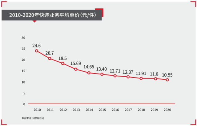 國(guó)家郵政局?jǐn)?shù)據(jù)顯示,2020年,中國(guó)快遞行業(yè)單票價(jià)格僅為10.55元/件,相較于2010年的24.60元/件,下跌近60%。
