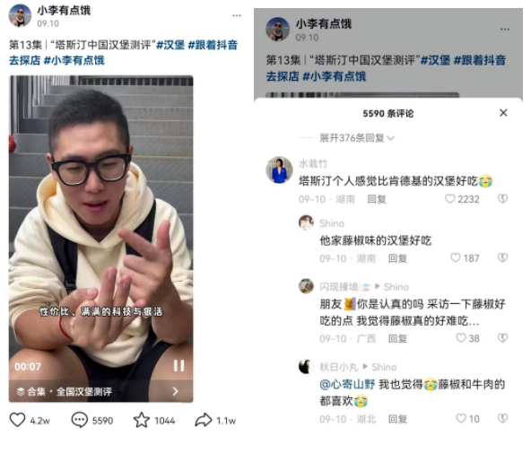在抖音上,有一個熱度頗高的塔斯汀漢堡測評視頻,其來自于測評博主@小李有點餓。