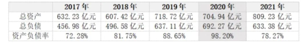 從2016年-2021年,國(guó)美的總負(fù)債分別為408.27億元、456.98億元、637.11億元、692.27億元、633.38億元,2020年資產(chǎn)負(fù)債率甚至達(dá)到98.2%。