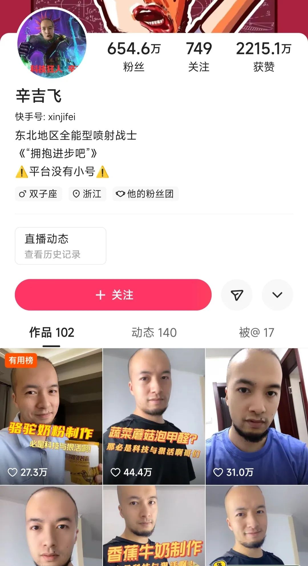 正當(dāng)輿論感嘆“飛哥有骨氣”,一眾熱捧就差讓辛吉飛肉身成圣之時(shí)。他潤到了快手,然后又漲了幾百萬粉。