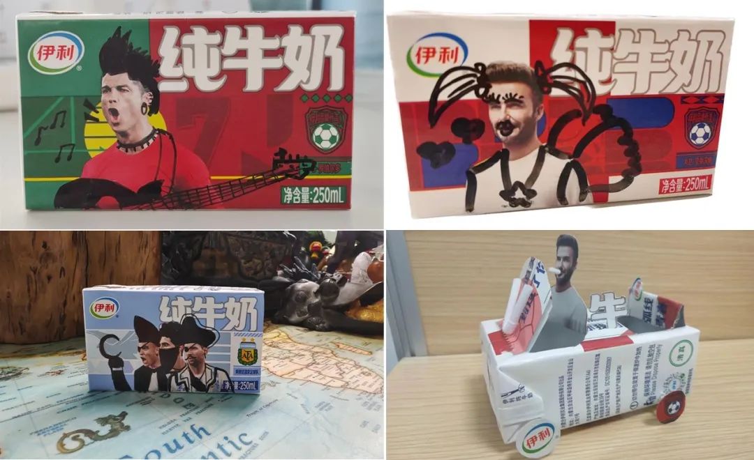 而在今年的足壇盛會(huì)開始前,伊利的限定裝仿佛在包裝設(shè)計(jì)的時(shí)候,就考慮到了社媒用戶熱愛惡搞、二創(chuàng)的屬性。因?yàn)闊o論是正面人像還是背面標(biāo)語,粉絲在當(dāng)中都有很大的魔改空間。