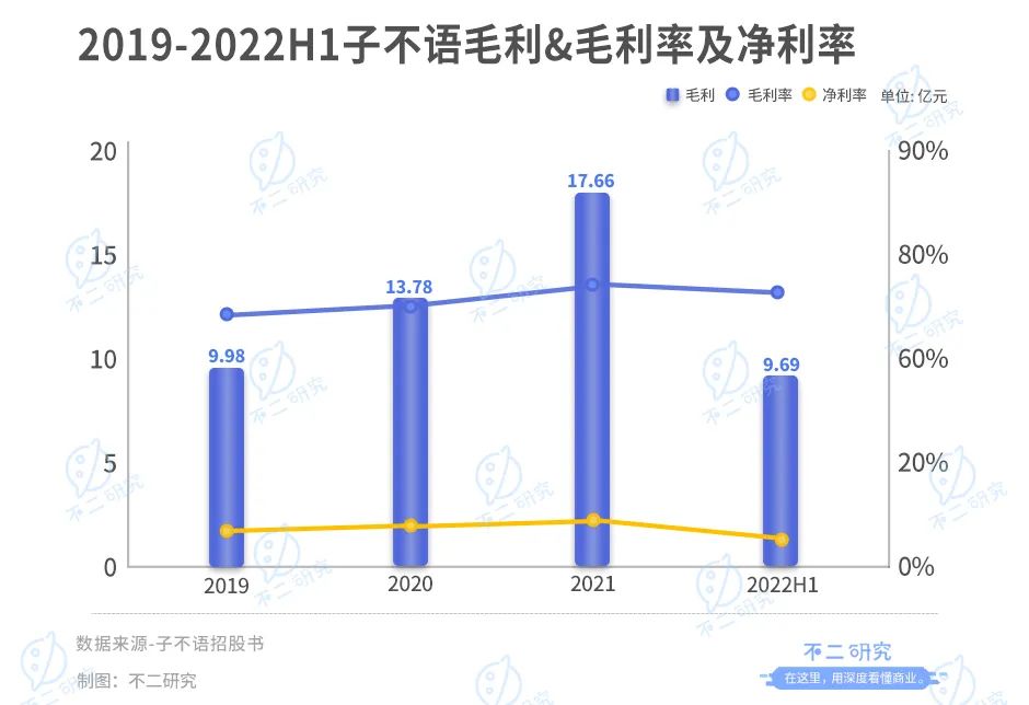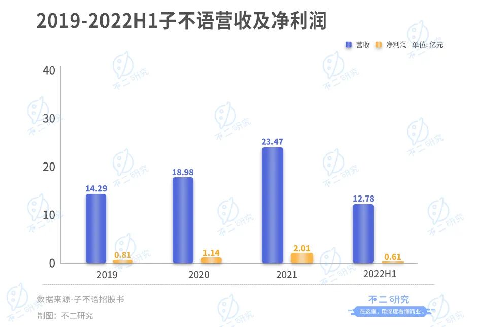 據(jù)招股書顯示,2019-2022上半年,子不語營業(yè)收入分別為14.29億、18.98億、23.47億和12.78億。同期,凈利潤分別為0.81億、1.14億、2.01億、0.61億。