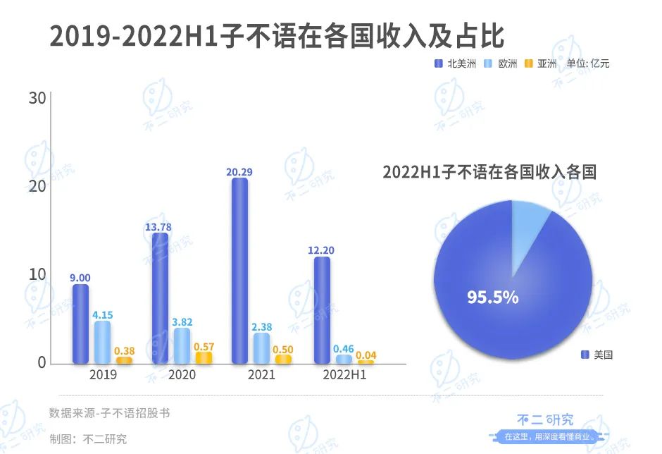 截止2022上半年,子不語在北美洲的收入占總收入的95.5%,其中美國占據(jù)95%;來自歐洲的收入占總收入的3.6%;而來自亞洲的僅有0.3%,可見其對于美國市場的偏愛,但另一方面也加劇了單一市場的“叛逆”風險。