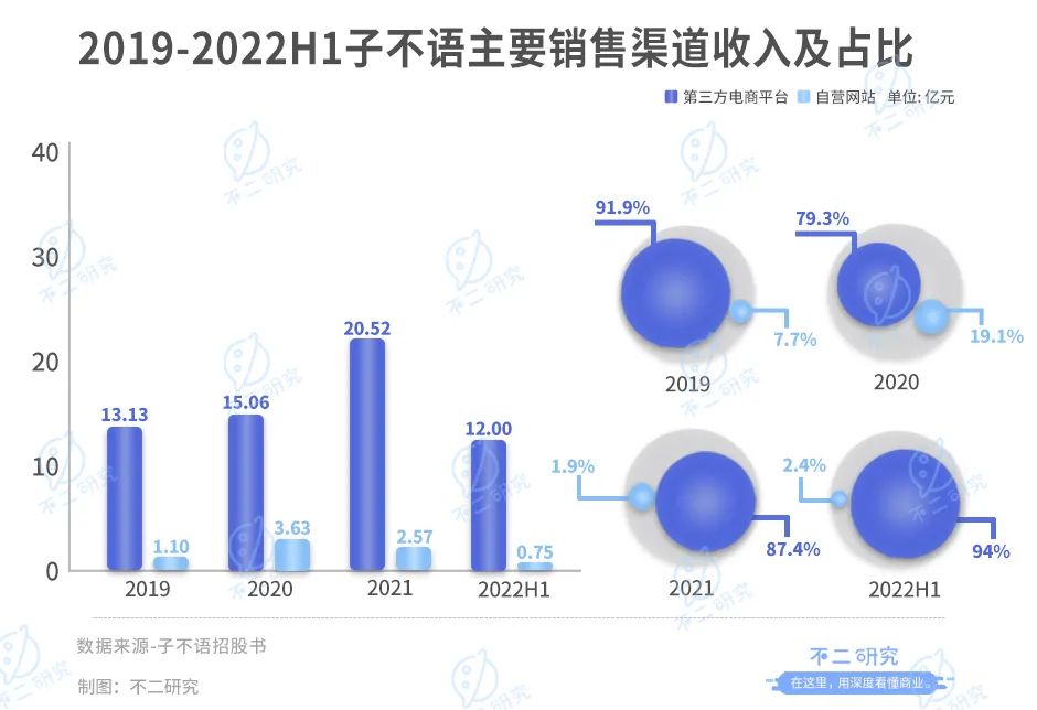 據(jù)子不語招股書顯示,其收入來源按銷售渠道劃分,主要分為第三方電商平臺和自營網(wǎng)站(以及其他)。2019-2022上半年,來自第三方電商平臺的收入分別占比91.9%、79.3%、87.4%及94.0%。