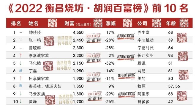 此外,榜單中,字節(jié)跳動39歲的張一鳴財富比去年下降950億元,即28%,以2,450億元位列第二,排名不變。寧德時代54歲的曾毓群財富比去年下降900億元,即28%,以2,300億元位列第三,排名不變。