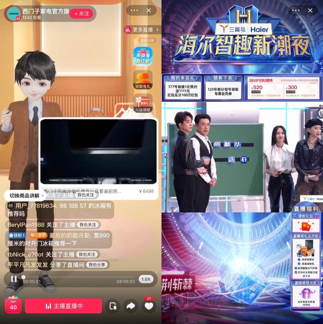 左圖西門子AI虛擬人直播/右圖海爾智趣新潮夜,圖片來源:天貓截圖
