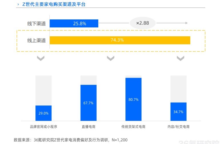 和美妝護(hù)膚、服飾食品行業(yè)的自播內(nèi)容相比,家電品牌更注重專業(yè)知識的輸出,無論是通過加長直播時長對產(chǎn)品功能進(jìn)行滾動講解,還是通過有意思的聯(lián)動進(jìn)行現(xiàn)場演示,都是為了讓消費者對產(chǎn)品有更詳細(xì)的認(rèn)知。除了加碼自播,家電品牌也在通過內(nèi)容吸引流量,搶奪年輕用戶的心智。隨著90后和Z世代開始步入租房和買房陣營,線上平臺成為他們獲取家電產(chǎn)品信息、購買家電產(chǎn)品的主流陣地。根據(jù)《Z世代家電消費及內(nèi)容興趣報告》顯示,74.3%的Z世代選擇線上渠道,其中直播電商占比67.7%。