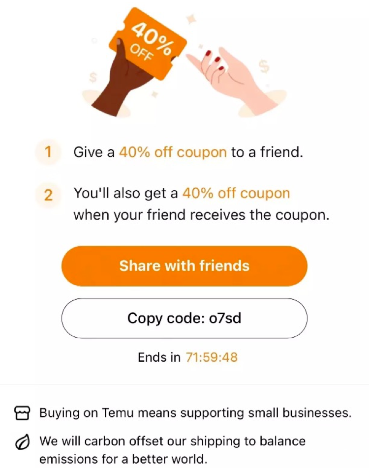當(dāng)然流量裂變的推廣模式依然在進(jìn)行,用戶只要將鏈接分享給朋友,雙方都能享受40%的折扣,這有一點類似于國內(nèi)好友拼單的模式。