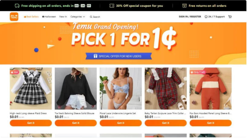 各種補(bǔ)貼政策讓人眼花繚亂。Temu網(wǎng)站上包含了14個類別的產(chǎn)品,包括服裝、配飾、寵物用品和美容產(chǎn)品,并且為首次購物者提供30%的折扣,訂單達(dá)到或超過49美元則會包郵并且不時也有限時的無門檻包郵活動,同時允許90天內(nèi)無條件退貨。