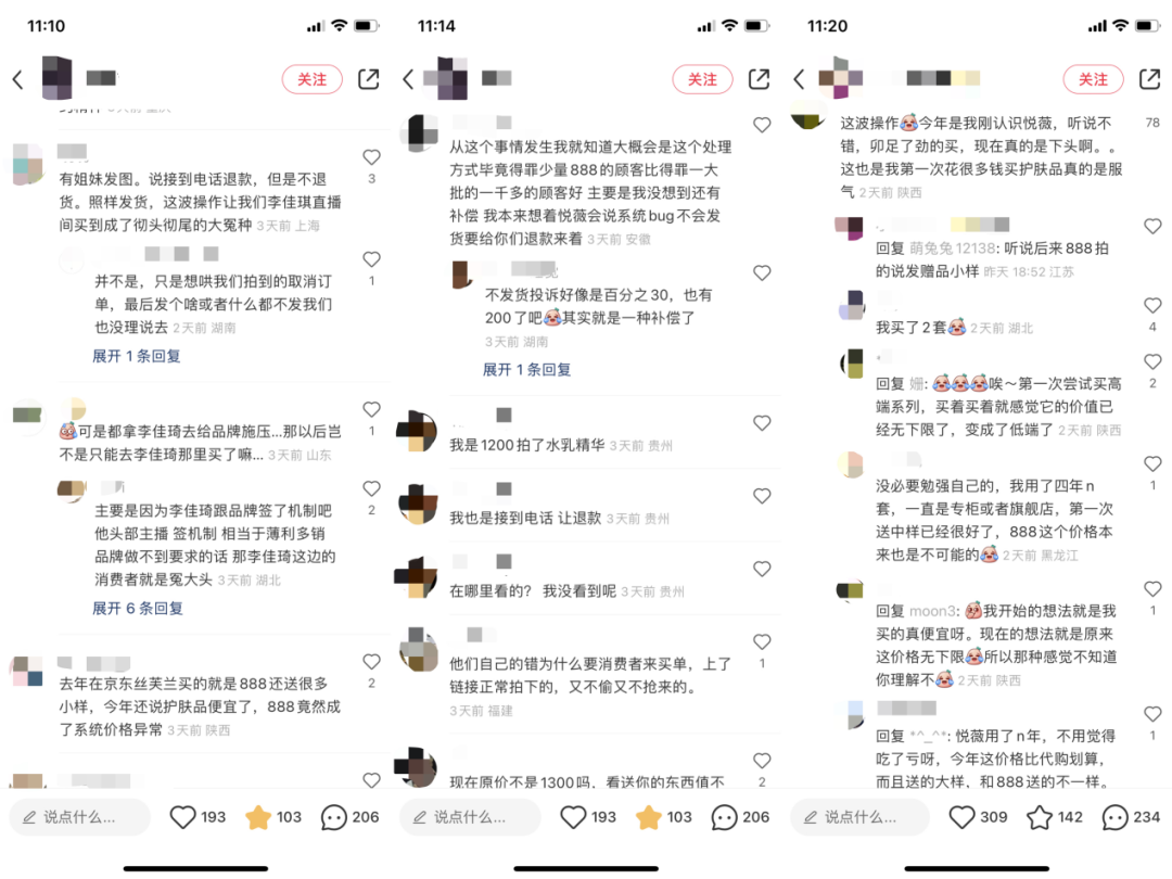 這就意味著,這部分用戶不花一分錢“白撿”了一套水乳,這才將李佳琦和品牌推上風(fēng)口浪尖!埃ㄖ换888元的消費(fèi)者)說(shuō)接到電話退款,但是不退貨。照樣發(fā)貨,這波操作讓我們李佳琦直播間買到的成了徹頭徹尾的大冤種”“剛開始覺得真便宜,現(xiàn)在發(fā)現(xiàn)價(jià)格無(wú)下限”“用了幾年敗好感”......