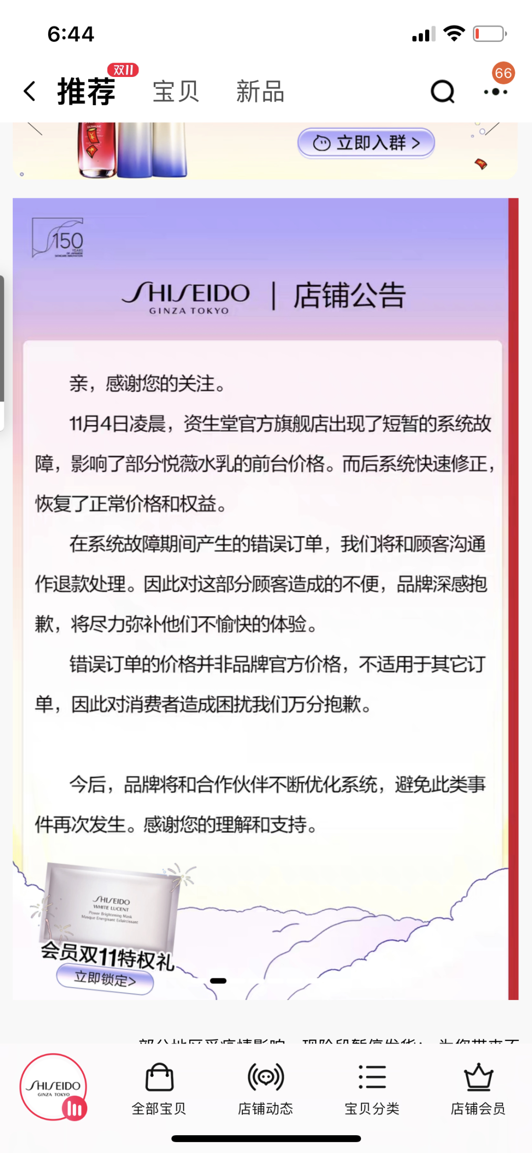 隨后11月4日晚,資生堂旗艦店發(fā)布公告解釋:11月4日0點(diǎn),因系統(tǒng)問題,店鋪出現(xiàn)了短暫的價(jià)格異常;目前店鋪商品已恢復(fù)正常價(jià)格;第一時(shí)間成立了專項(xiàng)小組調(diào)查和處理該問題;針對(duì)價(jià)格異常的訂單,將一一與相關(guān)消費(fèi)者溝通,統(tǒng)一做退款處理。