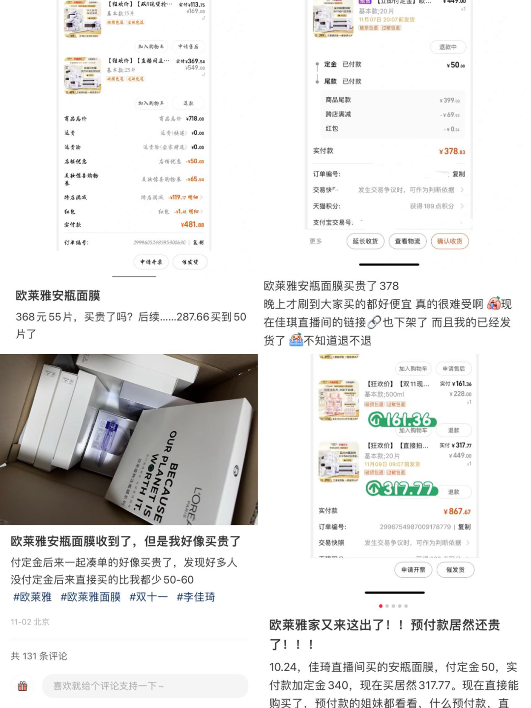 同時(shí)也有消費(fèi)者在社交媒體上吐槽在李佳琦直播間歐萊雅安瓶面膜買貴了,50片安瓶面膜有消費(fèi)者顯示實(shí)付429元、368元、328元、287元,還有人只用253元拿下。