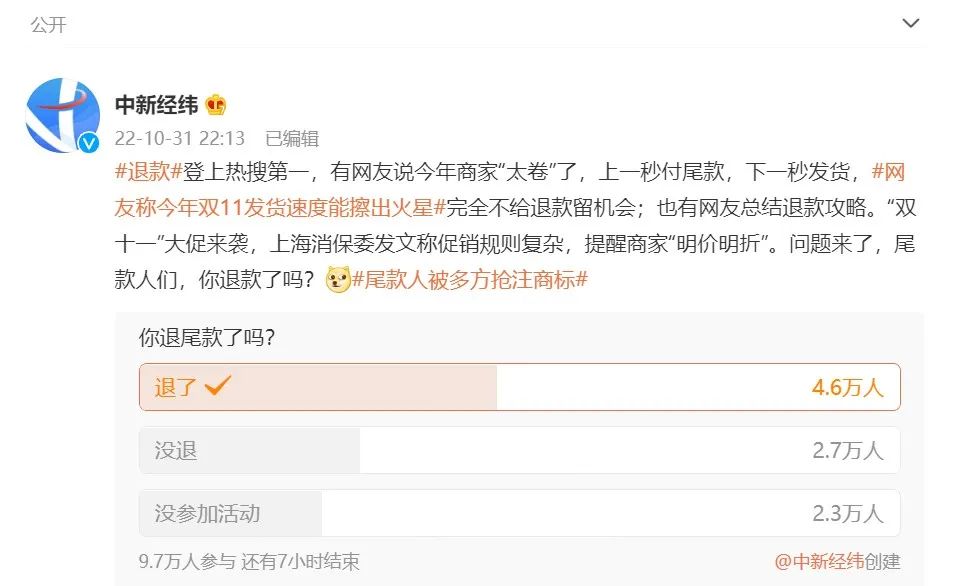 中新經(jīng)緯的一項雙11退尾款調(diào)查中,多數(shù)人選擇了退款。(圖源:微博)