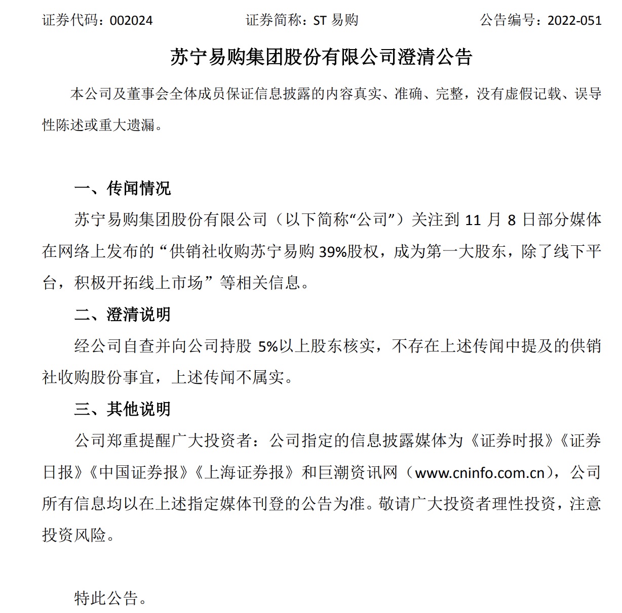 11月9日,ST易購(gòu)發(fā)布相關(guān)澄清公告。