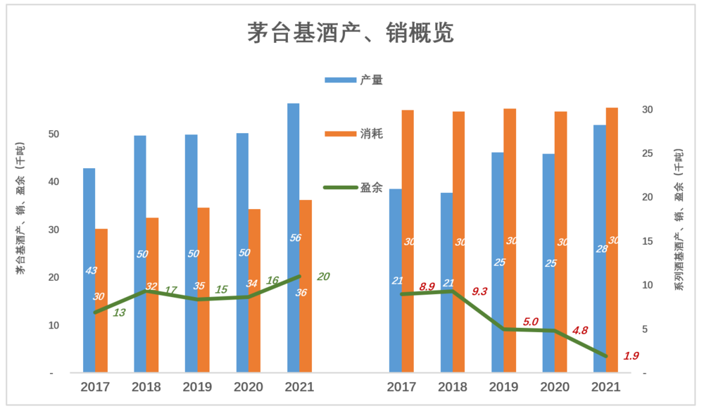 2021年,茅臺基酒產(chǎn)量達(dá)5.6萬噸、勾兌成品茅臺消耗3.6萬噸,茅臺酒盈余2萬噸。