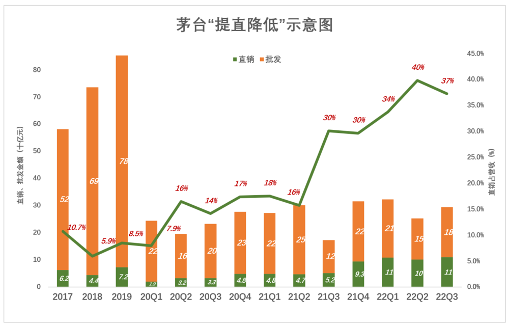 2021年9月,丁雄軍走馬上任,Q3批發(fā)代理收入直降79億、同比減少39.6%,而直銷收入同比增長58.1%、至52億。到2022年Q2直銷收入占比已達(dá)40%,2022年前三季度為36.7%。