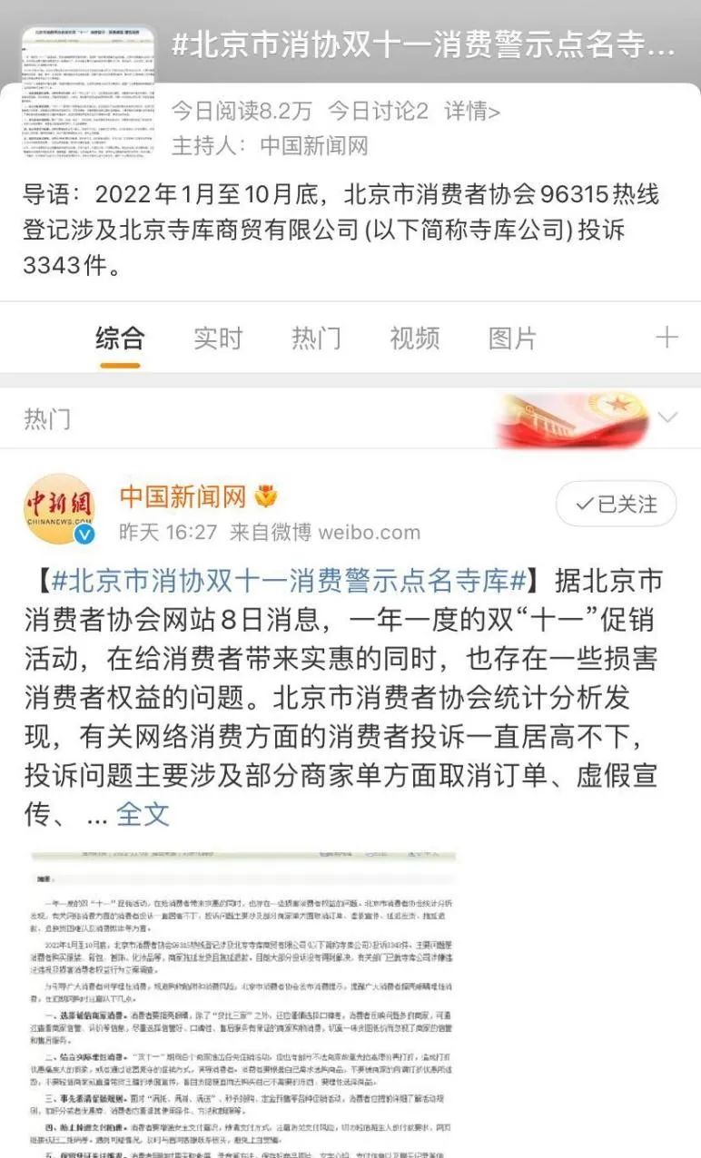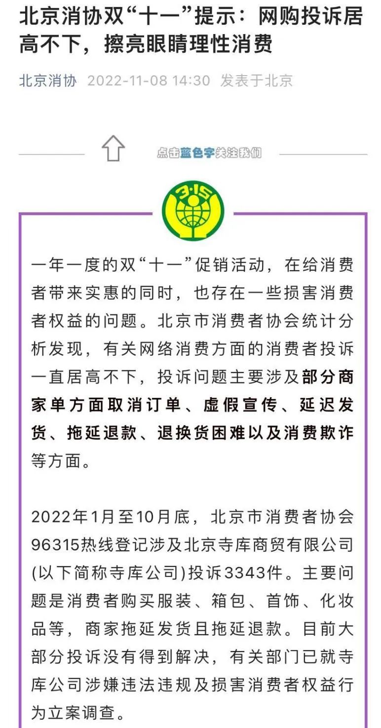 11月8日,北京消協(xié)發(fā)文稱,2022年1月至10月底,北京市消費者協(xié)會熱線接到有關北京寺庫商貿有限公司(寺庫)投訴3343件。大部分主要問題是消費者購買服裝、箱包、首飾、化妝品等,商家拖延發(fā)貨且拖延退款,目前大部分投訴沒有得到解決,有關部門已就寺庫公司涉嫌違法違規(guī)及損害消費者權益行為立案調查。