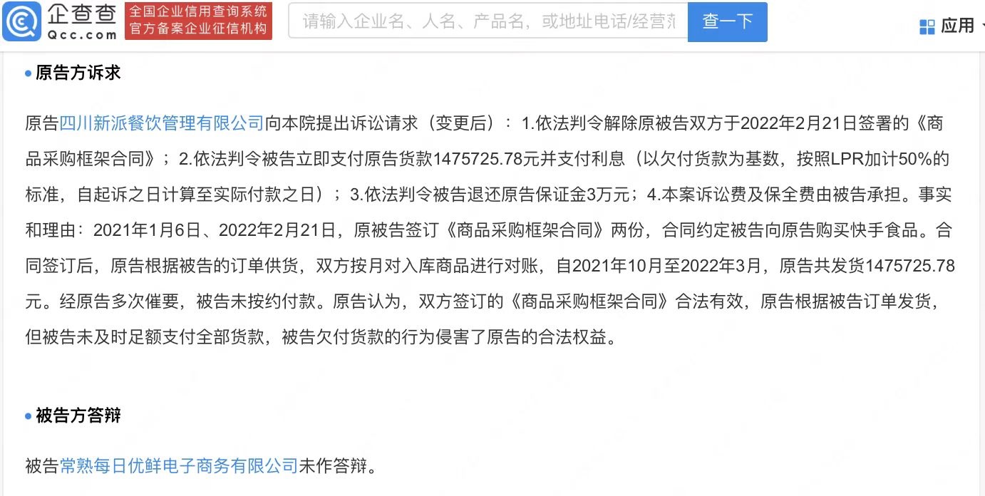 11月10日消息,企查查APP顯示,近日,四川新派餐飲管理有限公司與常熟每日優(yōu)鮮電子商務(wù)有限公司買賣合同糾紛一審文書公開。