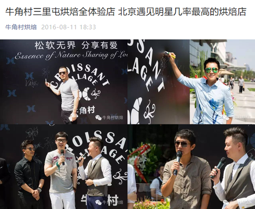 牛角包+臺灣面包師+進(jìn)口原料+烘焙課堂,讓牛角村從一種烘焙品牌中脫穎而出。但讓牛角村紅極一時(shí)的,是牛角村身邊圍繞的明星光環(huán)。